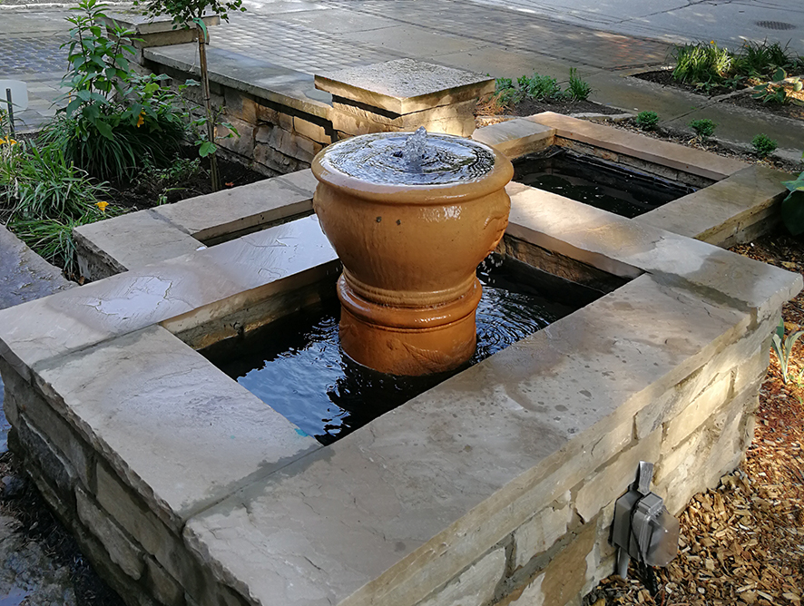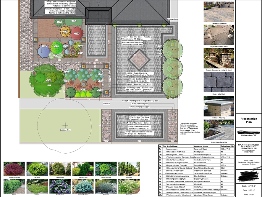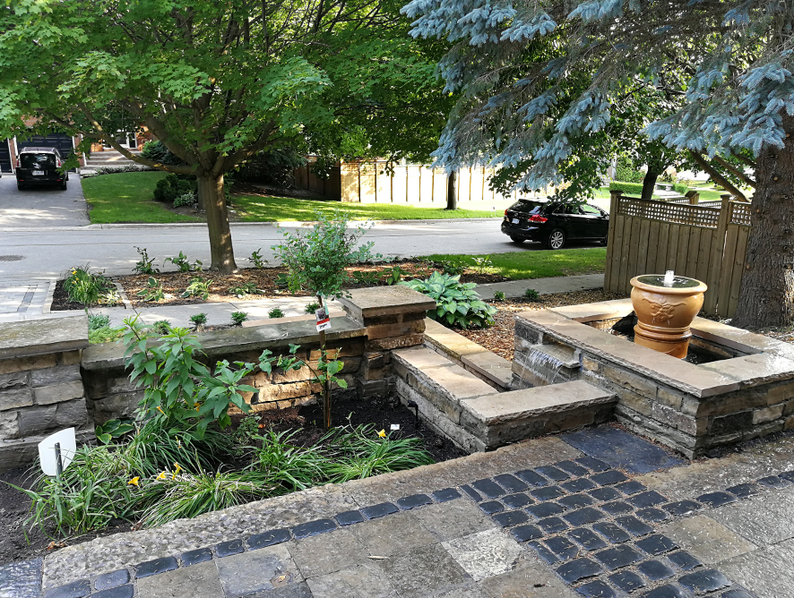 This house sits in an established neighbourhood. The design of the front is to give an Italian touch to the house. A multi level water fall with a stone wall is a focal point to the front view. Natural stone is selected for luxury look of the landscape. A stone patio with a sitting area is created at the entrance. Armour stone steps connect the front and the side path. A Rome style paving stone is added as the border of the new stone driveway and the entrance patio. Stone curbs at flower beds are another Rome landscape element. Boxwood at the edge of the mulch area creates a nice, neat and quiet feeling. Hosta at the boulevard is a comparison to the boxwood.