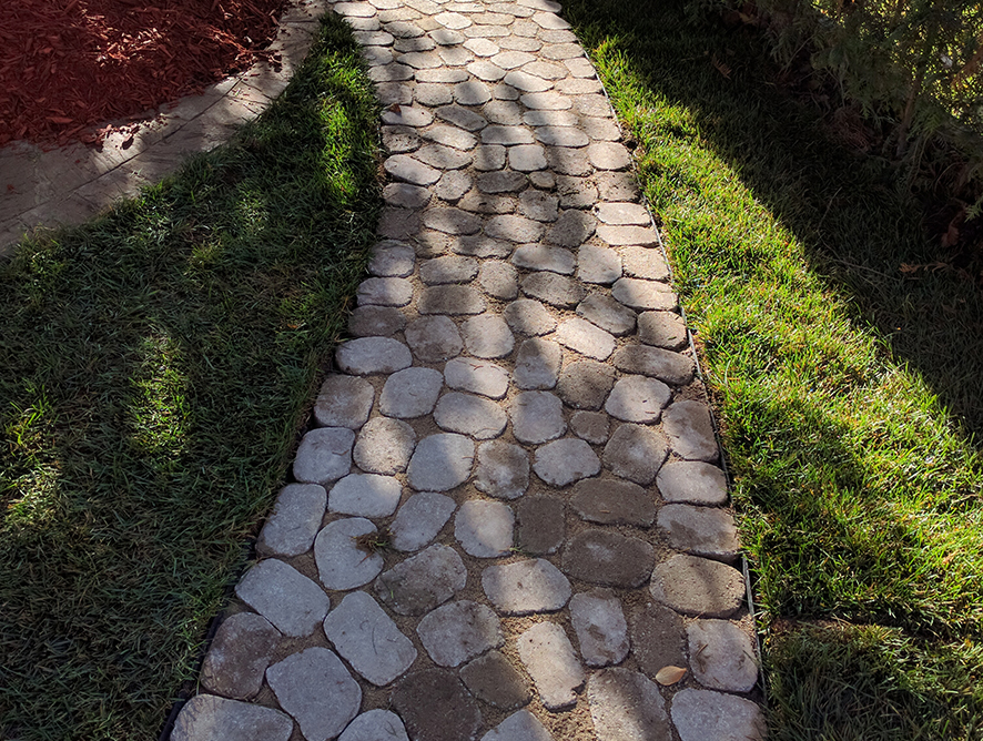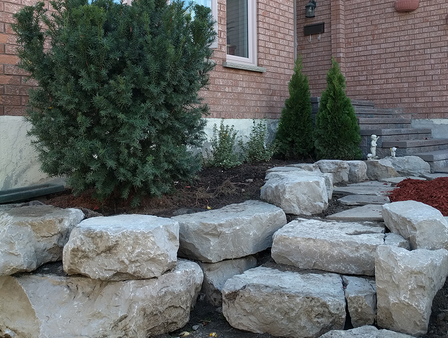 The front entrance is at the high point of the lot. We cleared the messy plants at the entrance and created new stairs, one to the door and another to the side of the house. The armour stone looks so solid that it makes the house a strong built feeling. The arrangement of the armour stone also create new planting areas and the plants give a welcome home sign to the family members when they come back home. A special shape stone was selected and was set at the front as a security guard for the home owners.