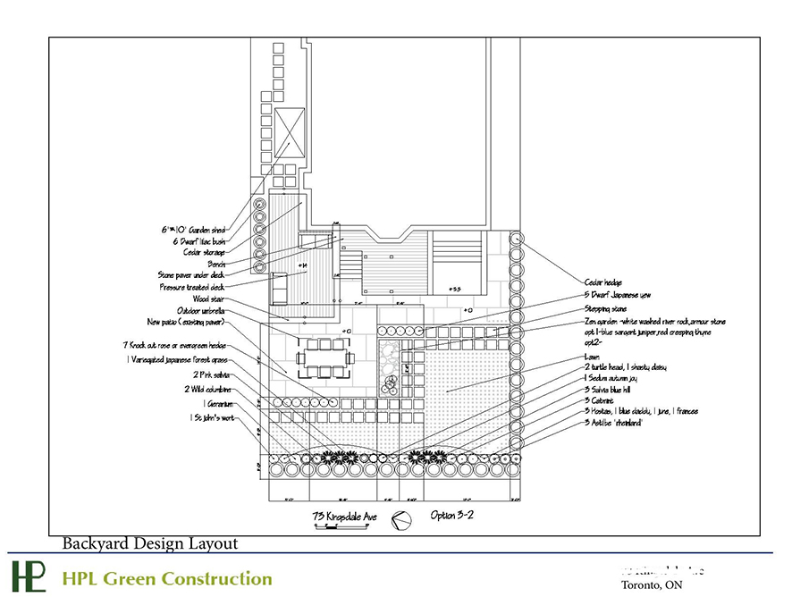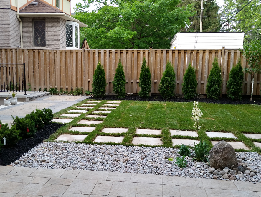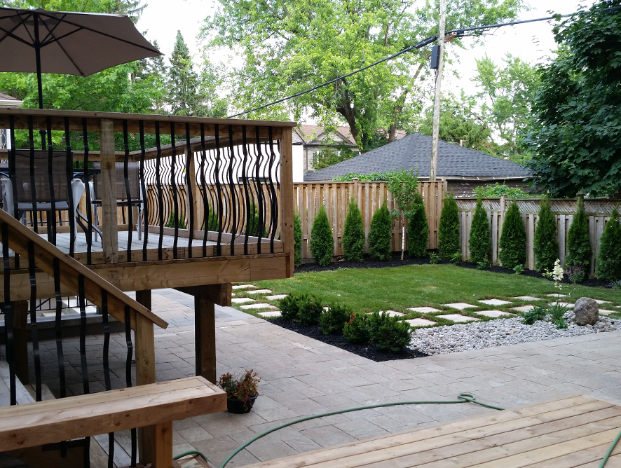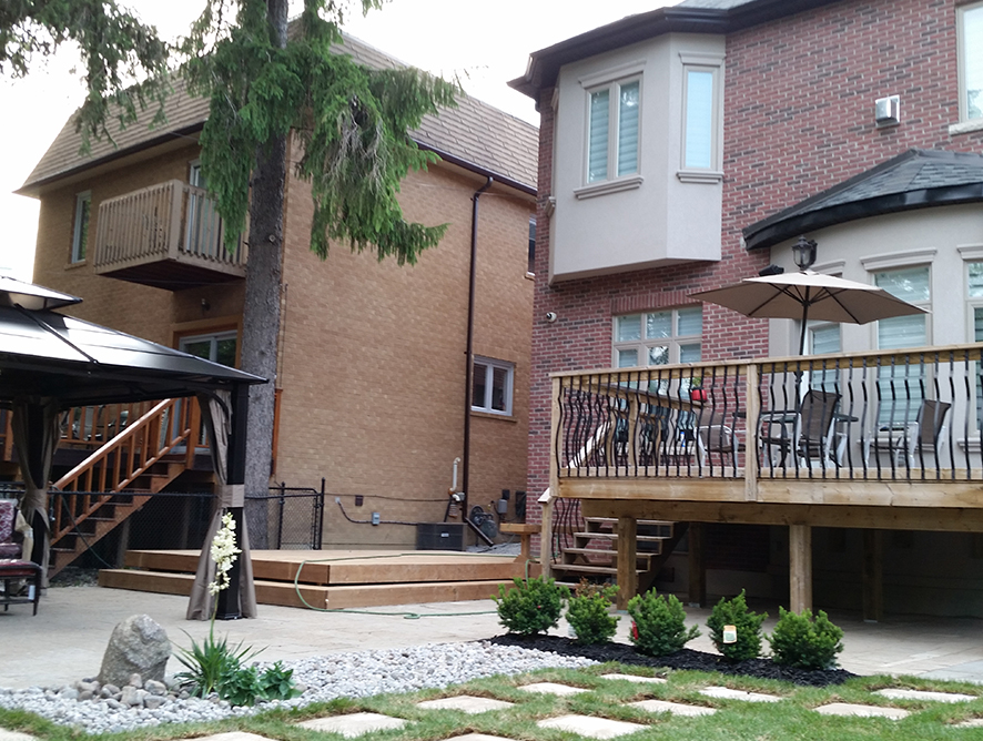 The main idea of the transforming is to make more functional places and adding privacy at the backyard. There is an existing deck so we build a lower level deck attached to the existing one to create a multi-level platform. Considering having more friends gathering, we extend a stone patio with a top covered gazebo beside the lower deck. A Japanese style rock garden is added before the patio as a focal point. Different shrubs are added around the gazebo and along exiting fences. New Emerald cedars lining up before the fences set a well organized landscape to the backyard.