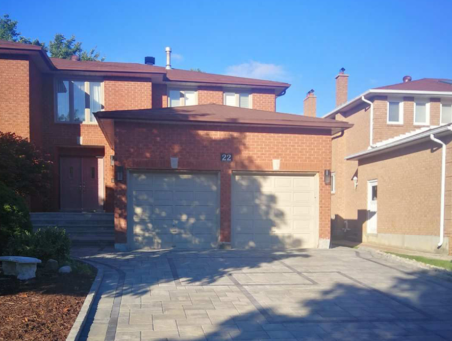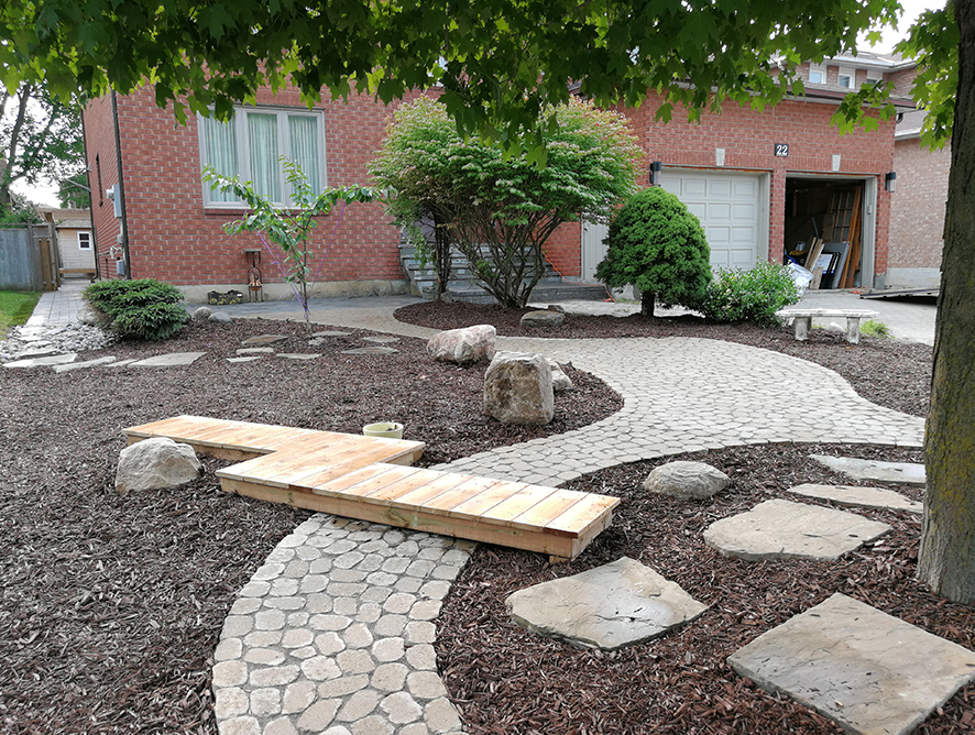 The front yard is another story. The family does not have time to maintain a green lawn so we converted the front into a nice looking dry creek like garden. “Rivers and islands” are set into the design. The curve stone path symbolizes river and the mulch areas with future plants are islands. A small wood bridge is built to match the backyard style. The transformation makes the front an attractive curb view.