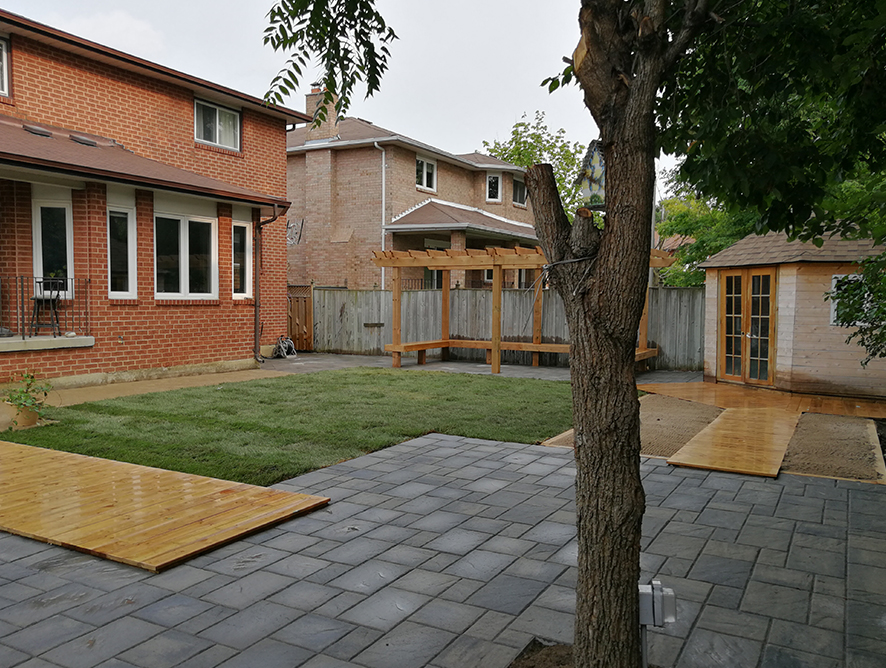 The father of the family loves wood and the mother has a good taste of art. They have two little lovely girls. Our plan was to create a nice pergola type outside office at the backyard for the daddy, special stone shape for the mommy , sand pit for the two girls and a vegetable garden for the family, and for sure a patio for friends. To add wood elements, we built two low wood decks to connect functional areas and separate spaces. The wood benches under the pergola create sitting areas, and serve as outdoor camping beds so family members can lie down and enjoy night time at the backyard in summer. The lawn in the middle of the backyard gives a soft touch to the final result. The backyard looks big and interesting when the transformation is done.